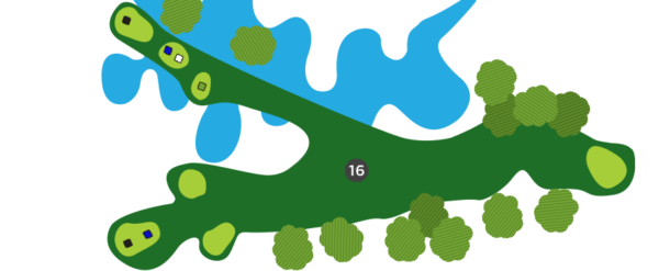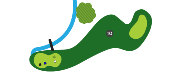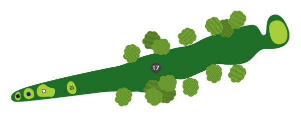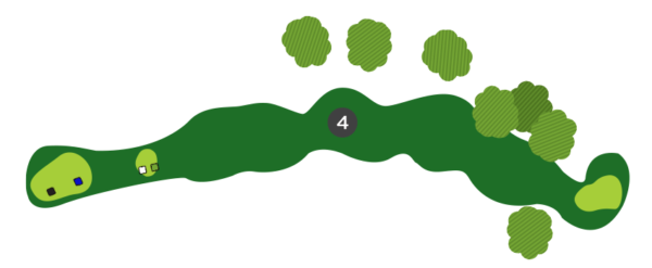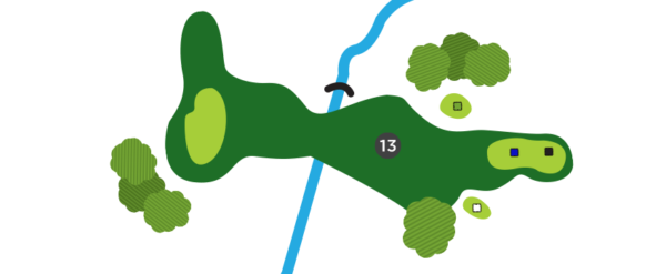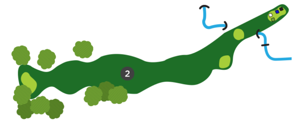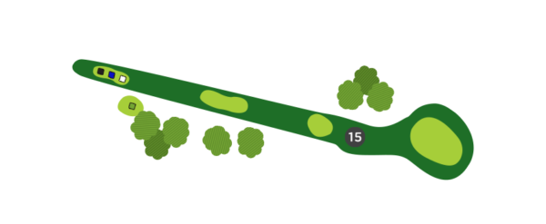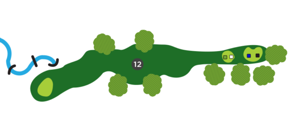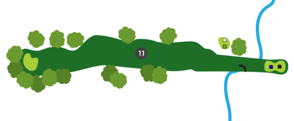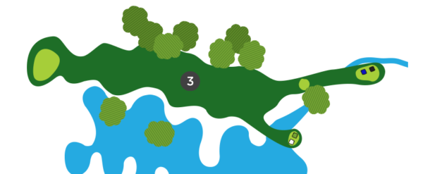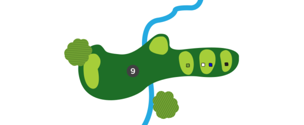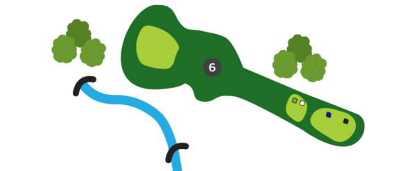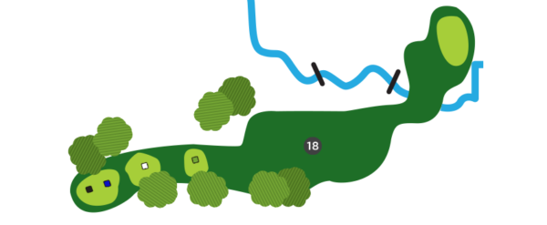 Une fois sur la droite du trou, favorisez le côté gauche du vert, car il y a un ruisseau en jeu sur la droite et la dénivellation du vert est très prononcée de ce côté.