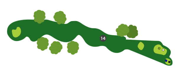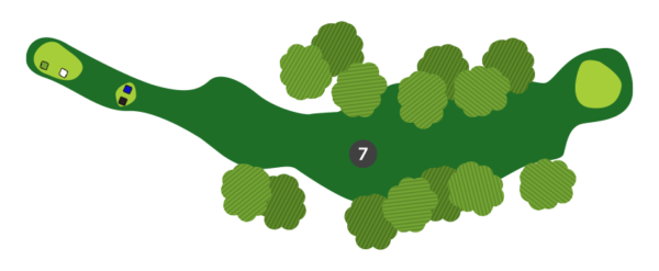 Ici, le long coup est de rigueur. Vous devez frapper assez fort, car la pente à l’avant du vert freinera votre balle, mais pas trop, car les sapins à l’arrière du vert ne sont pas tellement accueillants.